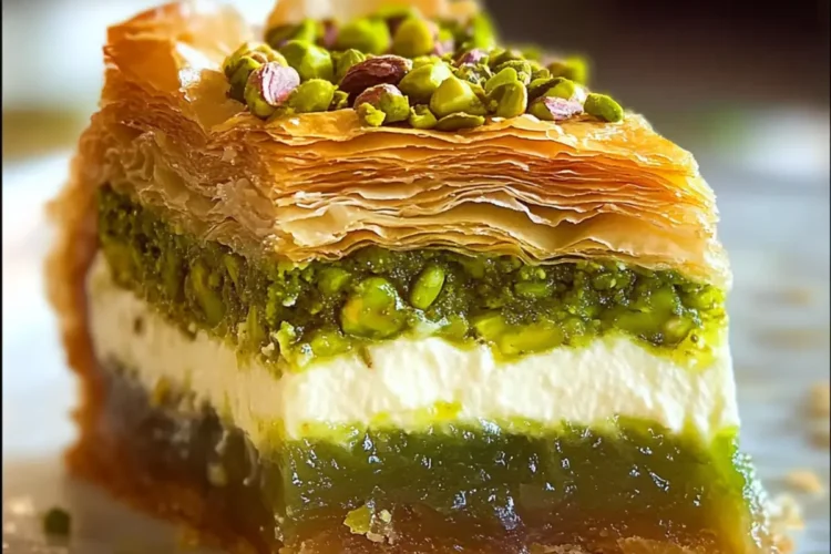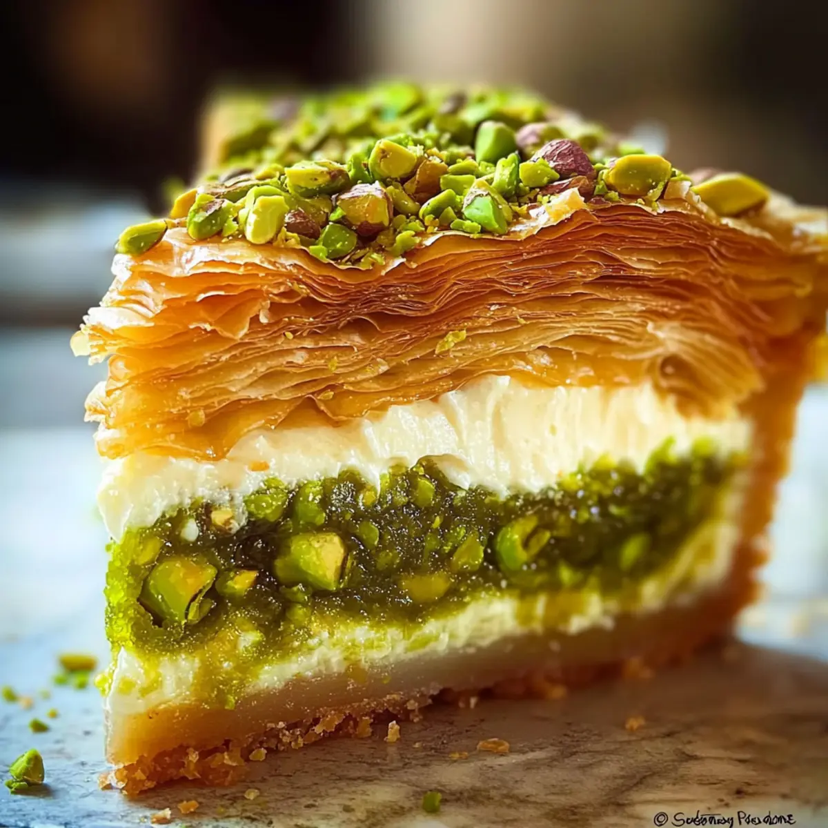 Indulgent Layers: The Baklava Pistachio Cheesecake brilliantly layers rich cream cheese filling with the nutty flavors of pistachio and honey, creating an irresistible taste sensation.