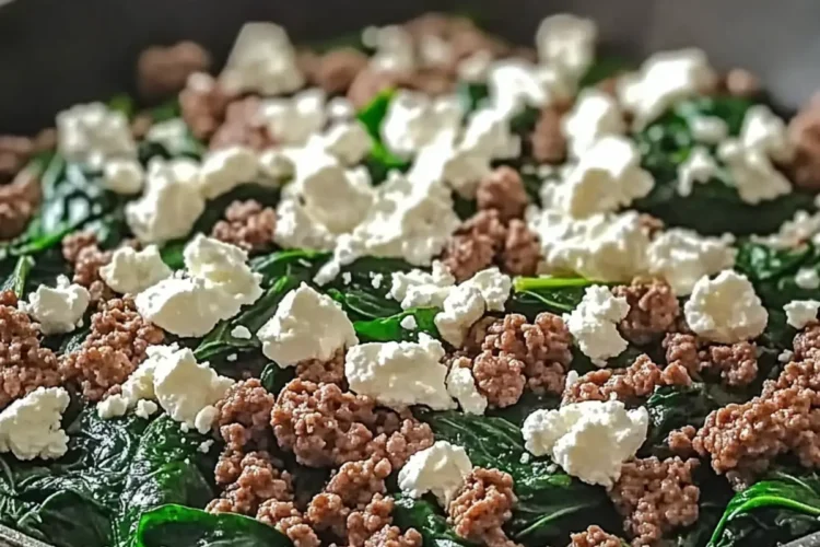 Remove the skillet from the heat and sprinkle ½ cup of crumbled feta cheese on top of the hot mixture. Allow the residual heat from the Beef and Spinach Skillet to melt the feta slightly, creating a creamy topping that complements the savory beef and fresh spinach beautifully.