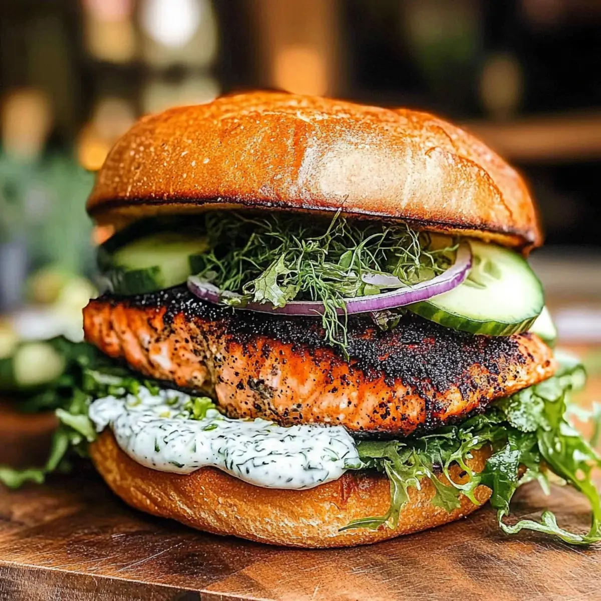 - Assemble the Sandwich: Layer the toasted bun with salmon, greens, cucumber, and onion.