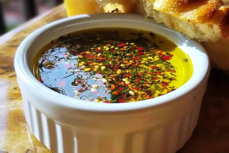 After the infusion, take a shallow dish or ramekin to transfer your flavorful oil mixture into. This not only presents beautifully but also makes it easier for dipping. You’ll see the vibrant colors of the herbs swirling in the golden oil, creating an inviting visual perfect for your appetizer spread.
