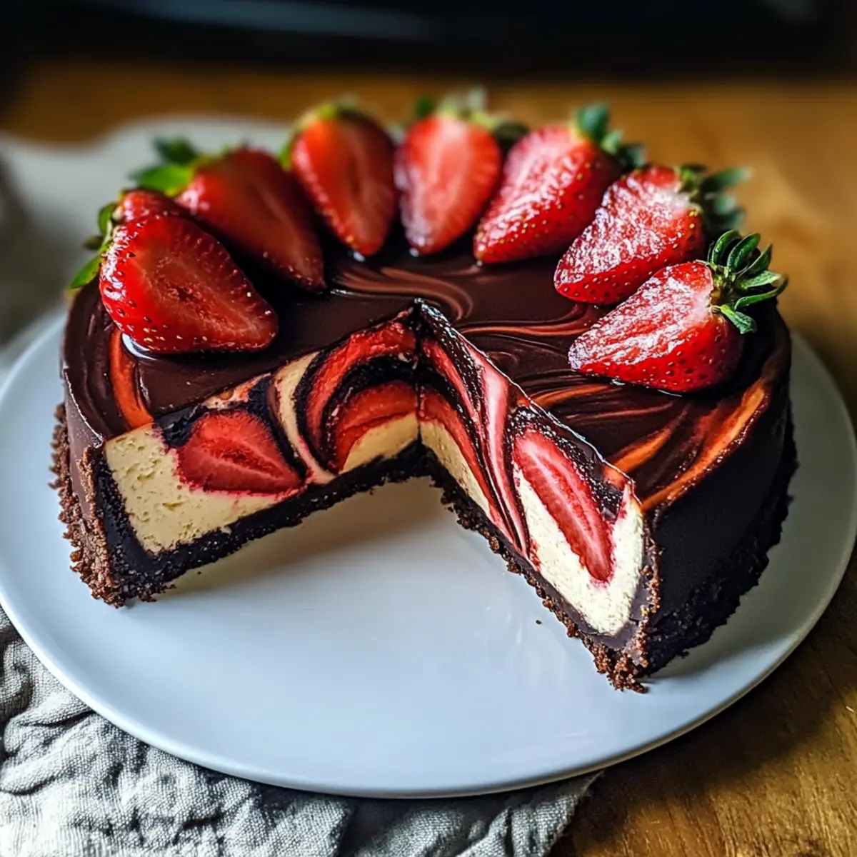 This Chocolate Strawberry Swirl Cheesecake is a delightful blend of rich chocolate and bright strawberry swirls that appeals to both the eyes and palate.