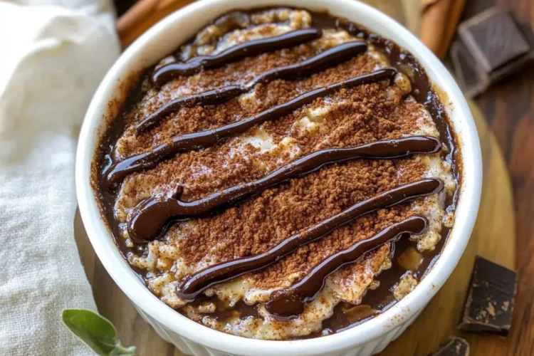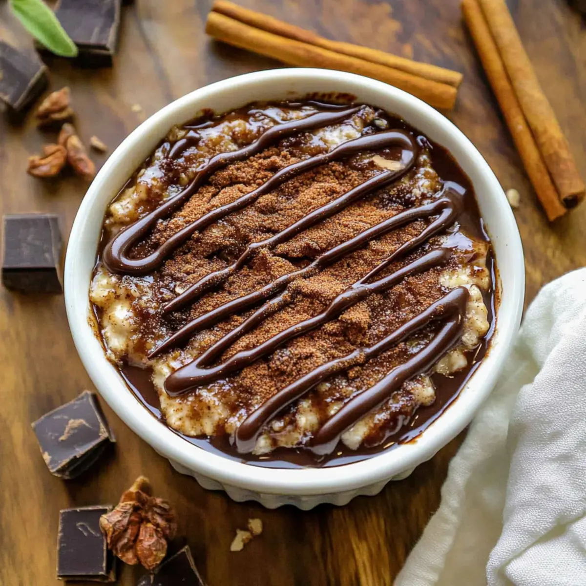 While the baked oats cool slightly, melt dark chocolate chips with coconut oil in a microwave-safe bowl. Heat in 15-second intervals, stirring in between until smooth. The luscious chocolate sauce will elevate your Churro Cheesecake Baked Oats to an indulgent treat. Drizzle generously over the warm oats for that perfect finishing touch.