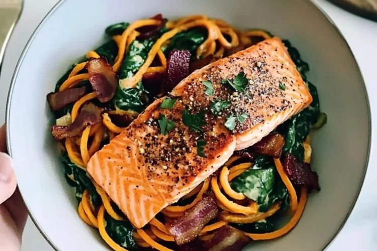 Once the sweet potato noodles are tender, stir in the fresh spinach until wilted, about 1-2 minutes. Then, gently fold the crispy bacon back into the mixture, ensuring an even distribution of crunch and flavor throughout your bowl. The vibrant colors and enticing aromas are a sure sign that your creamy salmon sweet potato noodle bowls are almost ready!