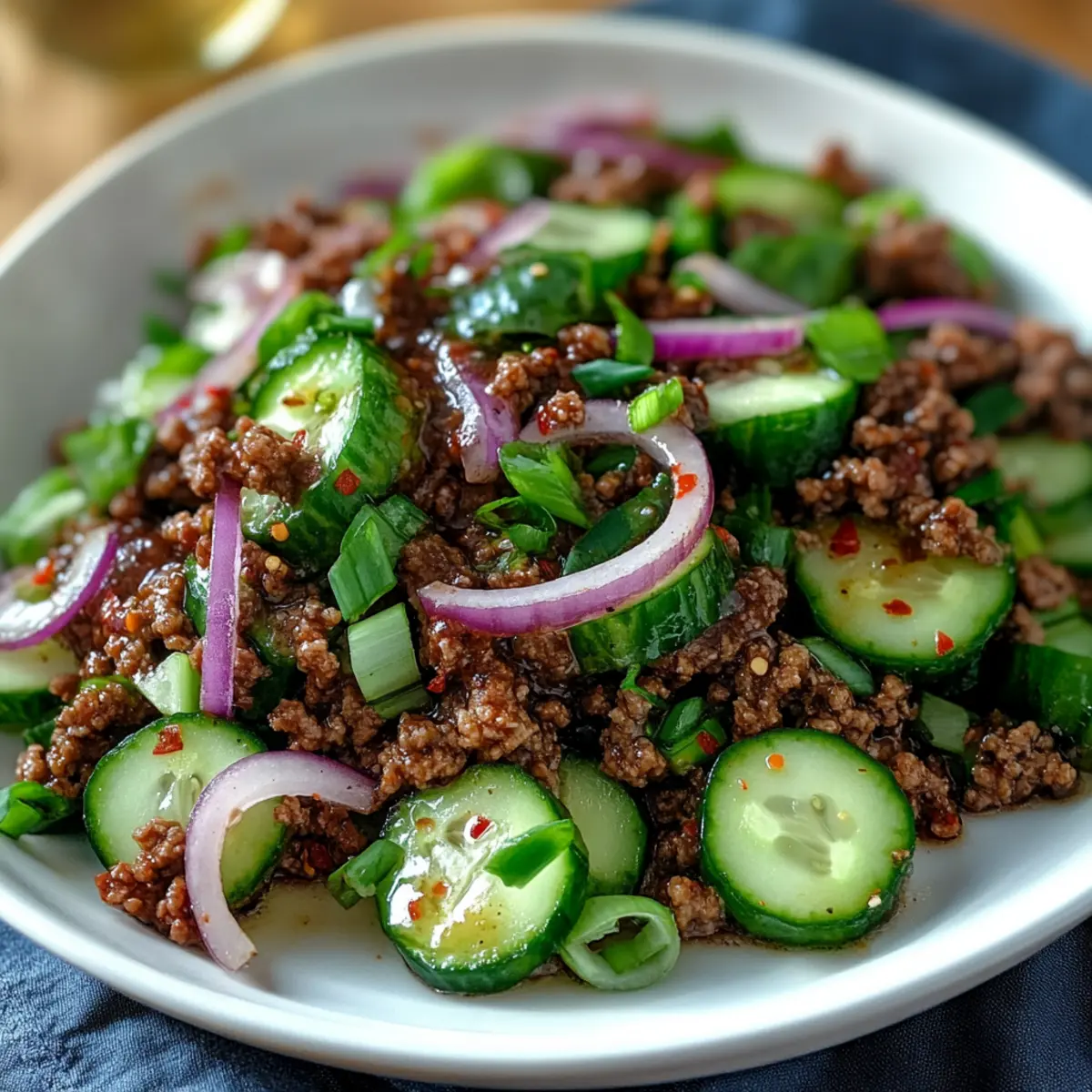 To maintain the crunchiness of the cucumber salad, it’s best to store it separately from the ground beef. Keep the dressing minimal until ready to serve, or prepare it up to 2 days in advance and assemble right before the meal. This way, the cucumbers stay crisp, enhancing the dish’s texture!