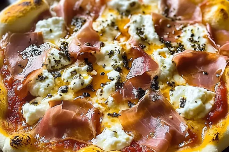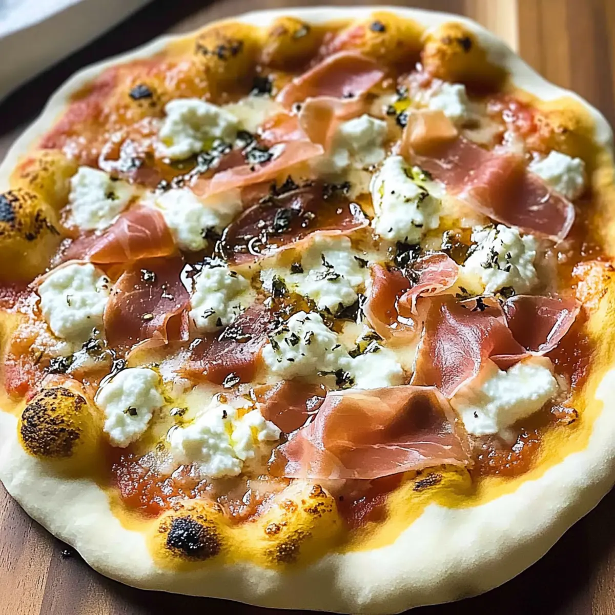 This Prosciutto White Pizza is a delightful blend of flavors, featuring creamy ricotta, gooey mozzarella, and savory prosciutto, topped with sweet hot honey.