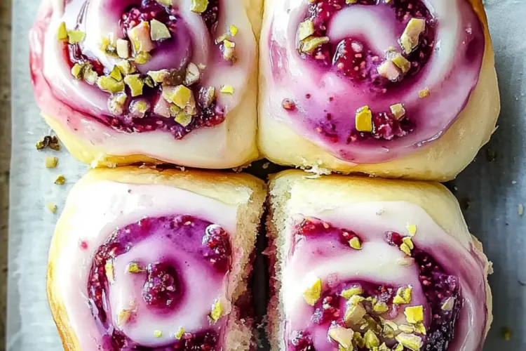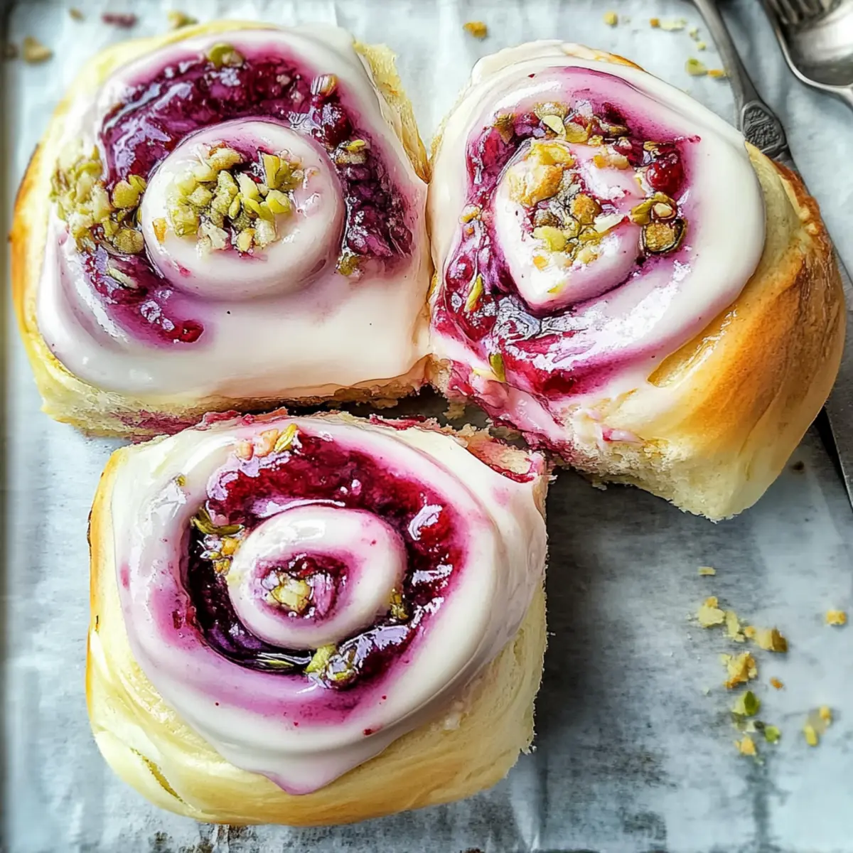 While the buns cool, prepare the glaze by mixing icing sugar, lemon juice, and rose water in a bowl until smooth. Brush the warm buns generously with this sweet glaze, allowing it to drizzle down the sides. For a finishing touch, sprinkle edible dried rose petals and chopped shelled pistachios over the top, transforming your Raspberry and Rose Cheesecake Buns into a breathtaking treat ready to be savored.
