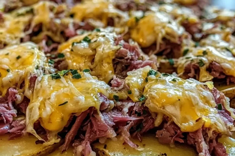 Once the baked potato slices are golden and crispy, it’s time to assemble the nachos. Layer the potato slices on a large serving platter and spread generous portions of tender corned beef over the top, followed by the sautéed cabbage. Sprinkle a hefty amount of freshly shredded cheddar cheese across the entire layered masterpiece.
