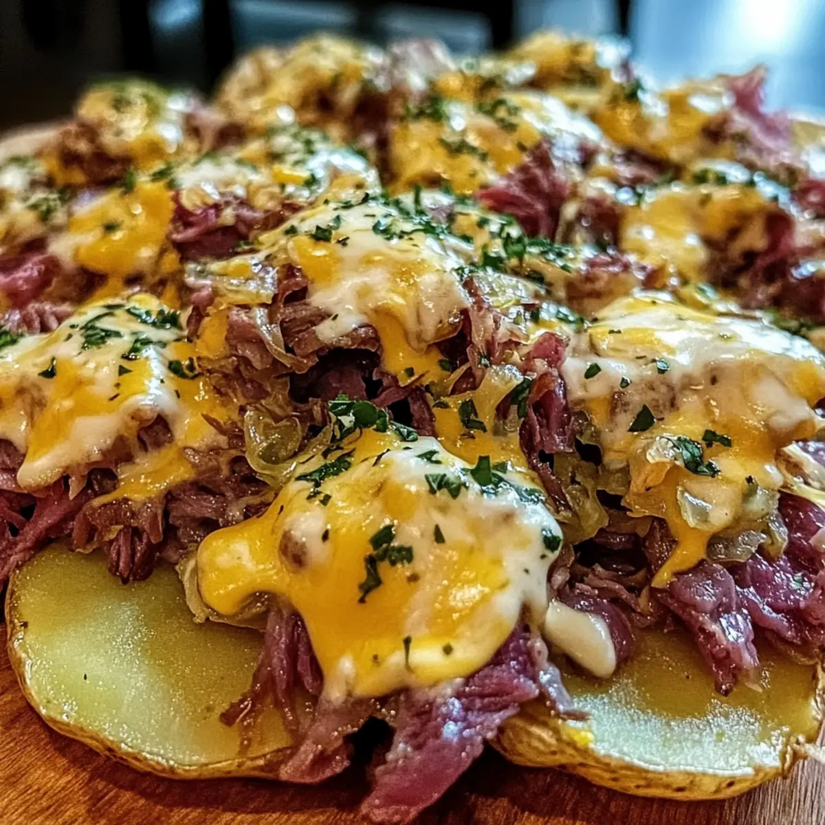 - Once the baked potato slices are crispy, layer them on a serving platter and top with corned beef, sautéed cabbage, and cheddar cheese.