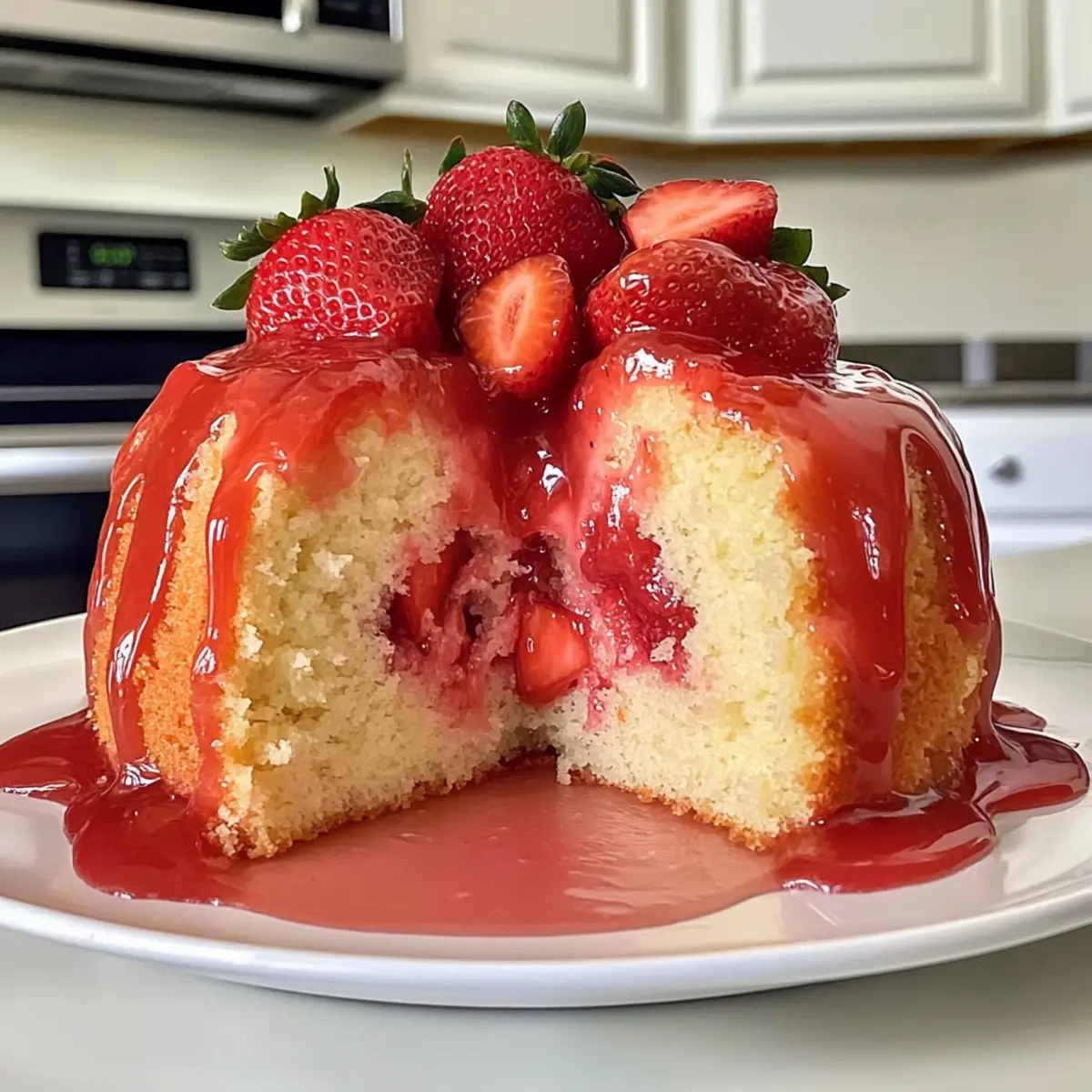 - Drizzle the glaze over the cooled cake and garnish with whole fresh strawberries.