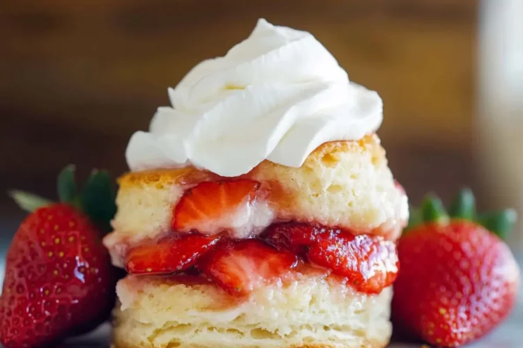- Assemble the shortcake by layering biscuits, macerated strawberries, and whipped cream.