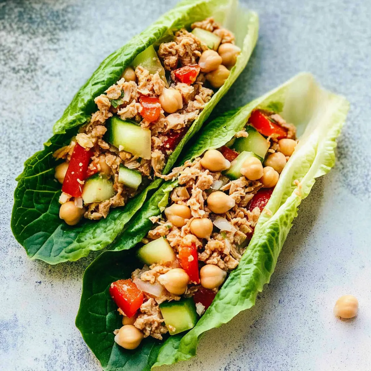 These On-The-Go Tuna Lettuce Wraps are fantastic for meal prep, allowing you to save time during busy weekdays. You can pre-prepare the filling mixture—combining half of the diced red pepper, cucumber, chickpeas, and your choice of flavored tuna—up to 24 hours in advance. Store the filling in an airtight container in the refrigerator to keep it fresh and flavorful. Additionally, you can wash and dry the lettuce leaves a day ahead, storing them in a damp paper towel to maintain their crispness. When you’re ready to serve, simply assemble the wraps by spooning the chilled filling into the lettuce leaves, and enjoy restaurant-quality wraps with minimal effort!